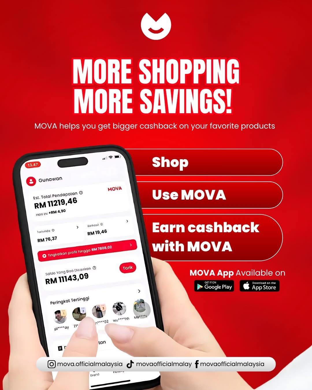 “MOVA ialah aplikasi cashback pihak ketiga yang inovatif, membolehkan pengguna menjana ganjaran tunai semasa membeli-belah di platform seperti Shopee dan TikTok.